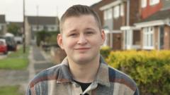 BBC Frankie Williams with short brown hair smiling into the camera. He's wearing a blue and cream checked shirt. He's stood outside in a residential area and in the background are houses, a hedgerow and parked cars.BBC