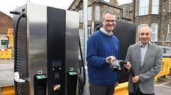 Councillor Mark Ieronimo, left, and Ben Gilligan, from East Yorkshire Buses, with one of the new EV chargers installed at the bus company on Anlaby Road