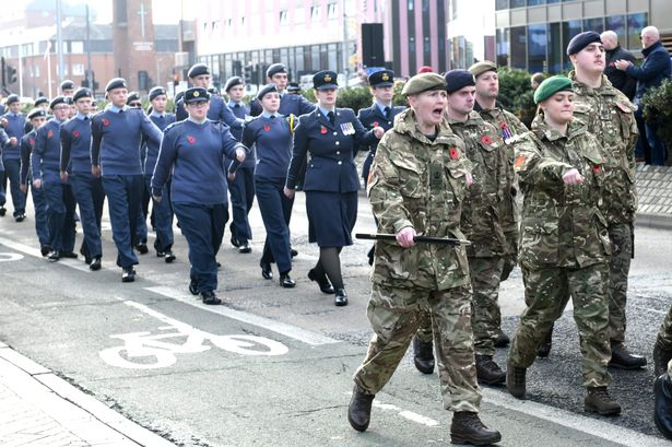 Crowds gathered in central Hull today to show their respect for servicemen and women who lost their lives in conflict. A military parade left Queen Victoria Square before moving down Carr Lane and turning north at the Ferensway junction to arrive at the Cenotaph.