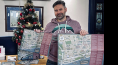 Hessle Local History Society Richard Royal pictured wearing a lilac coloured hoodie, with a decorated Christmas tree to his left, holding two difference sizes of his local history tour map.Hessle Local History Society